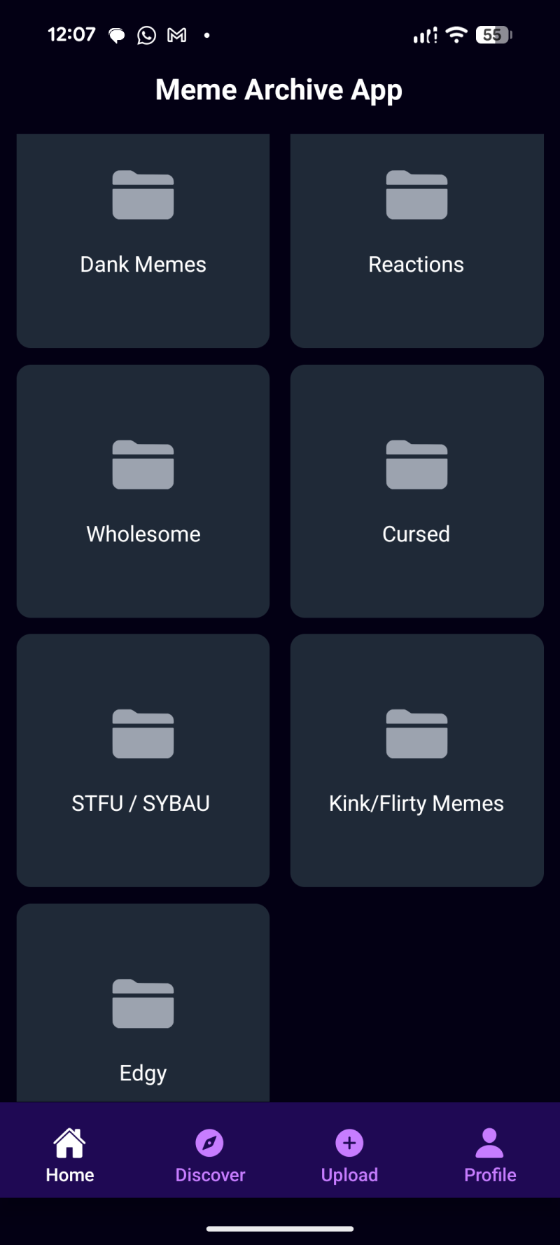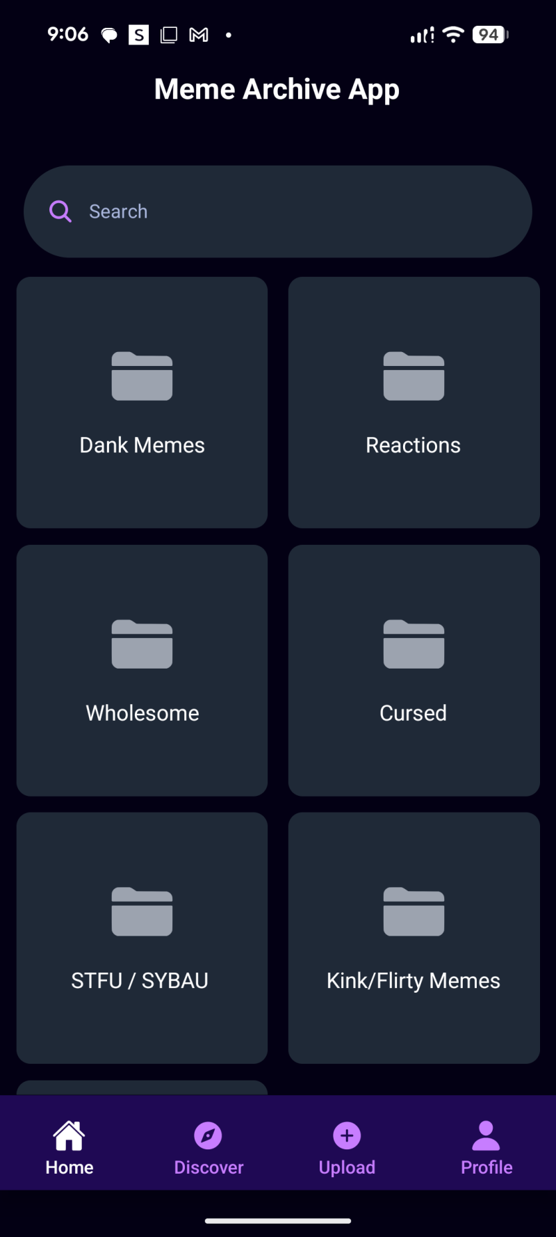 This app idea originated from my love of memes, and my need to organize them. I collect memes, memes for different contexts, things like flirty memes, reaction memes, memes for telling people to shut the fuck up, etc.
