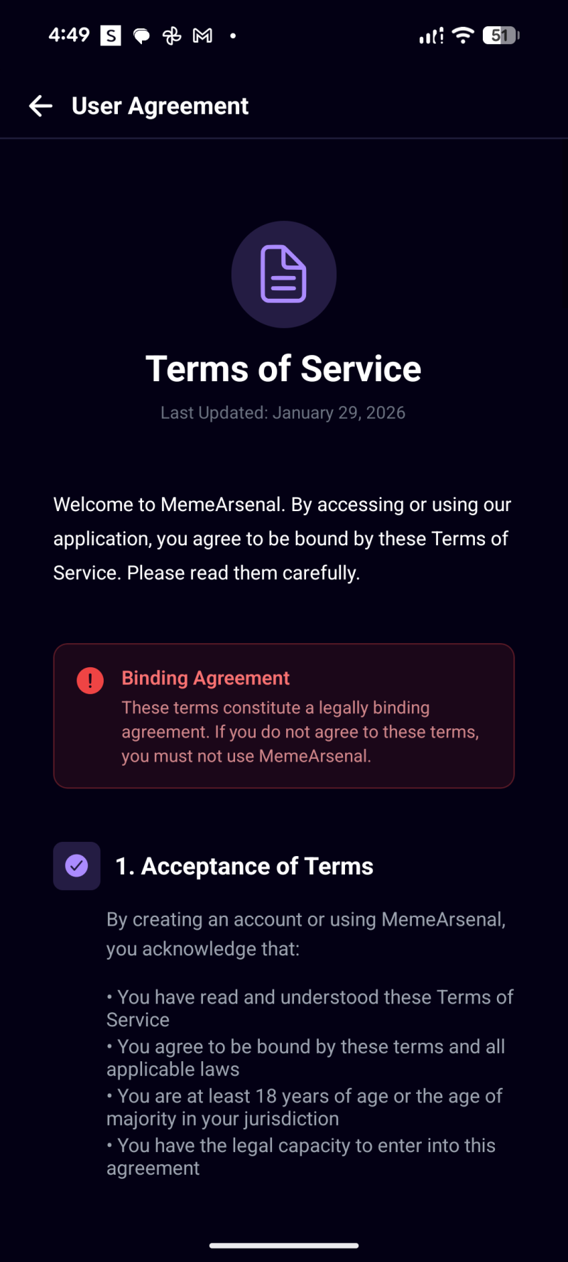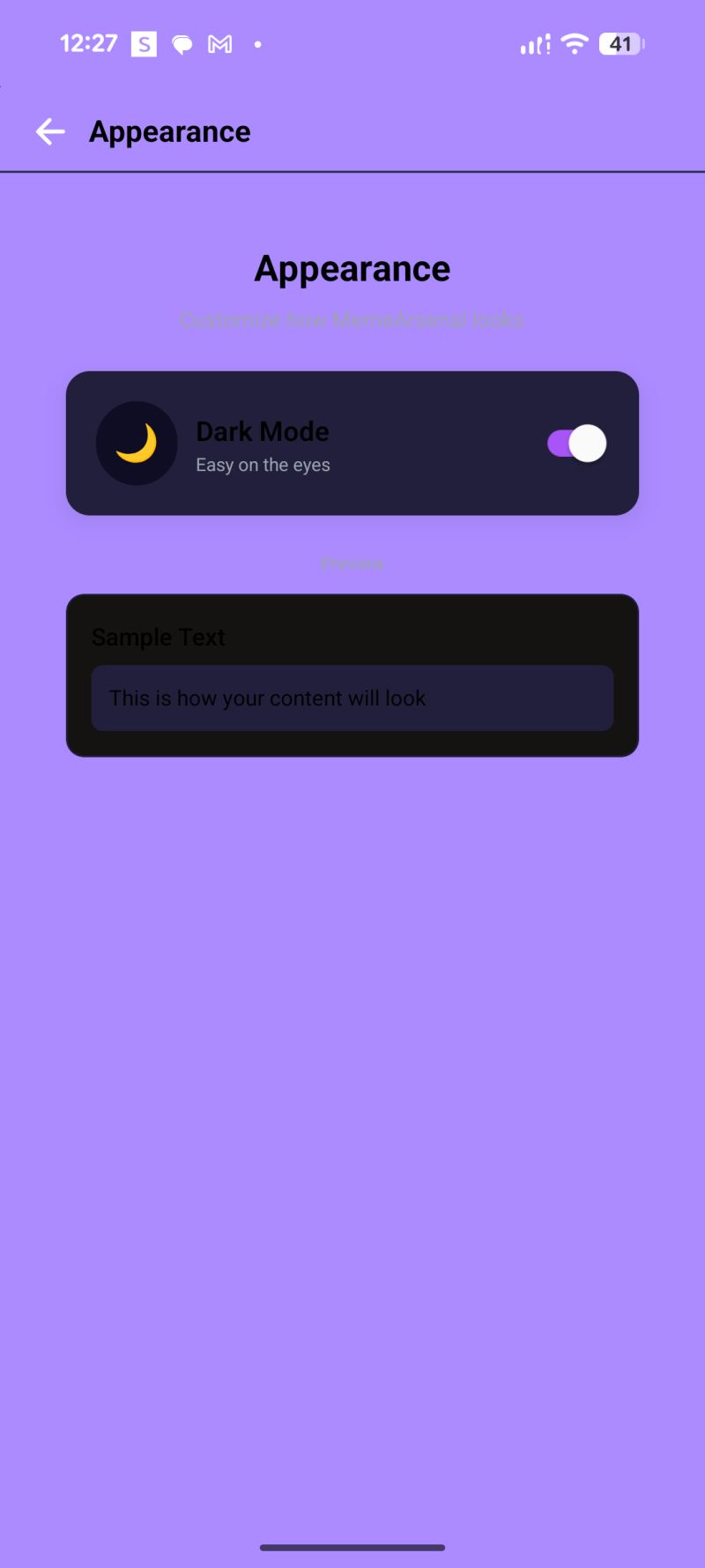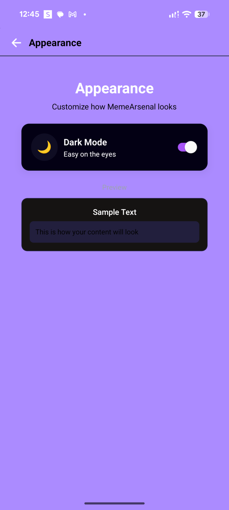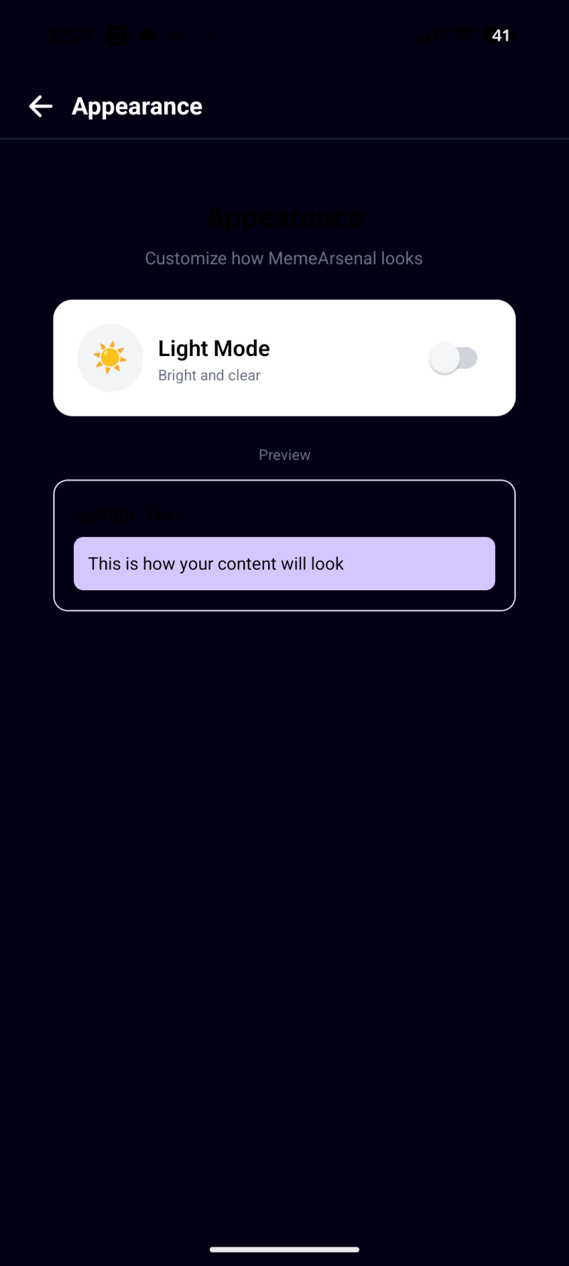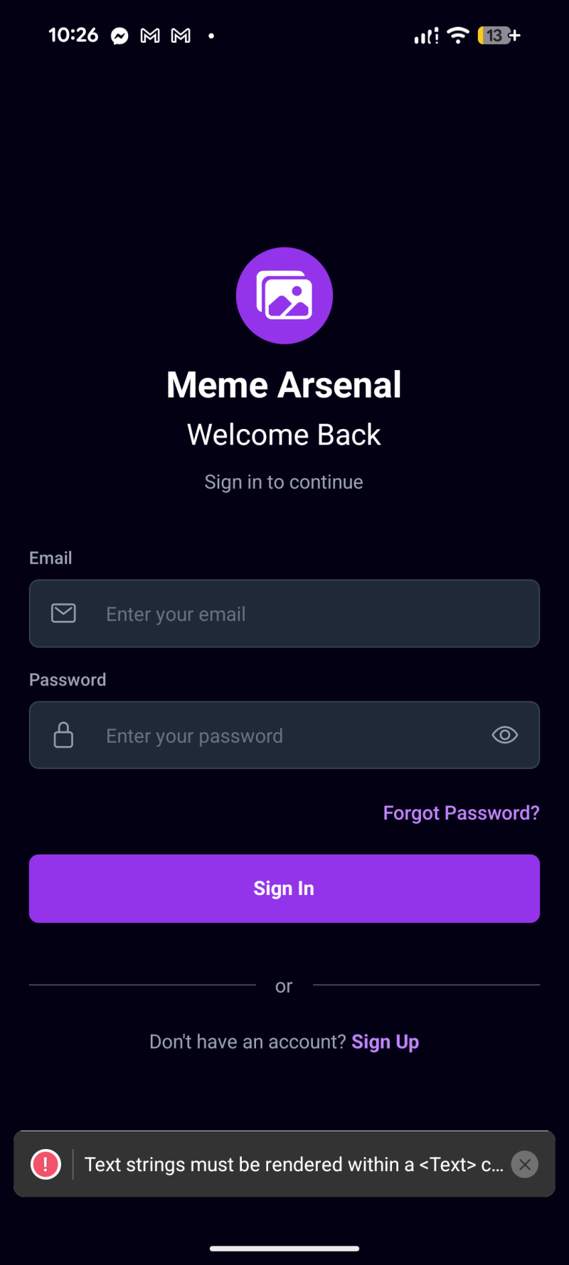- A centered logo circle (purple background + images icon) and the text “Meme Arsenal / Welcome Back”.