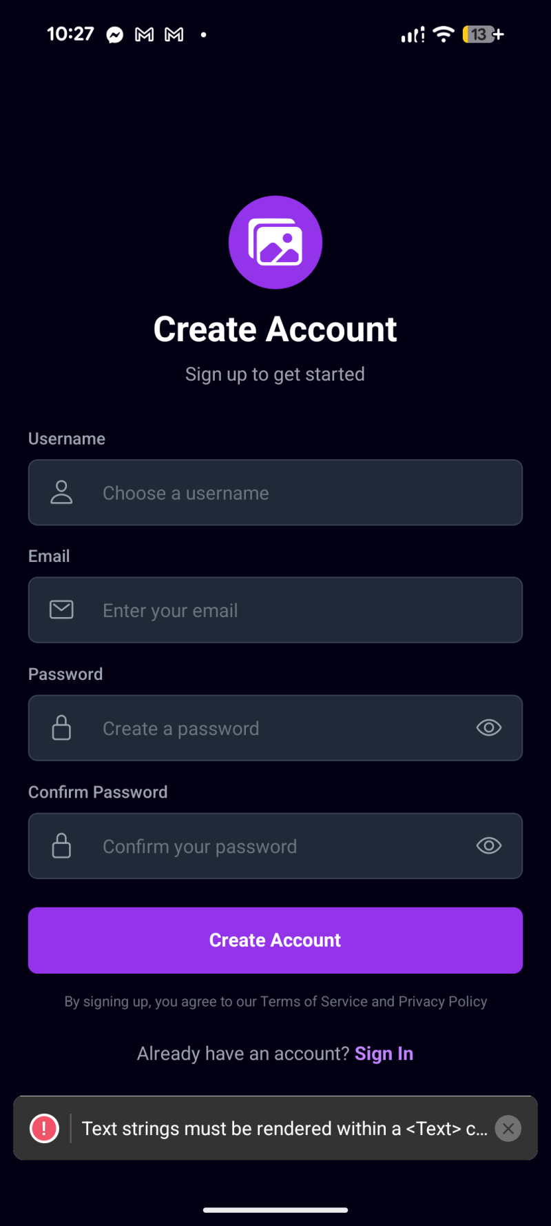 loadingis true. - A small terms text and a “Already have an account? Sign In” link at the bottom.