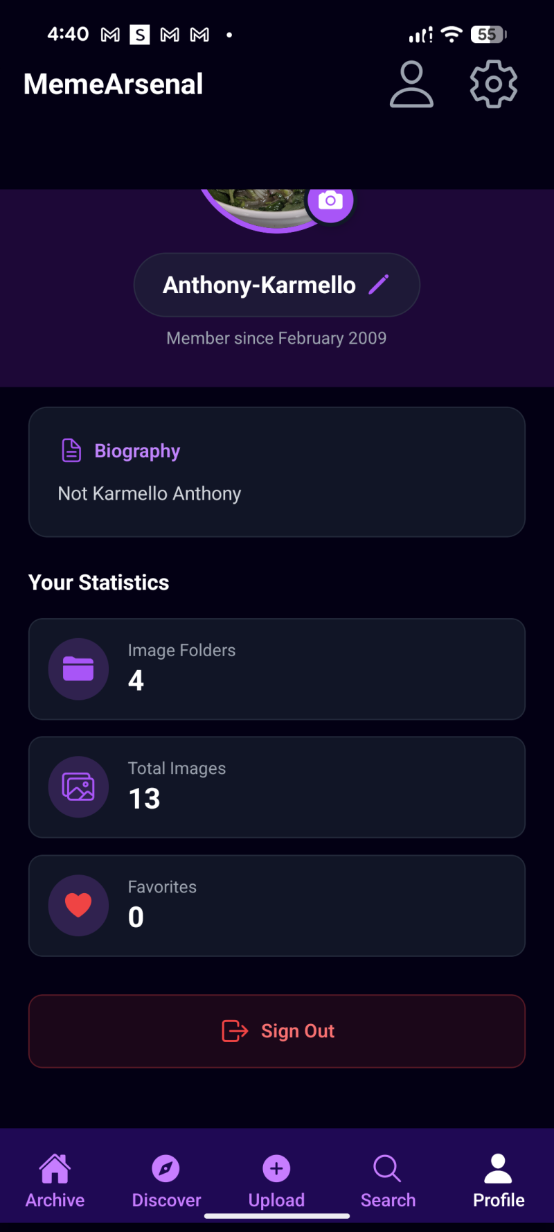 - On the Profile screen, I show a red-accent “Sign Out” button.